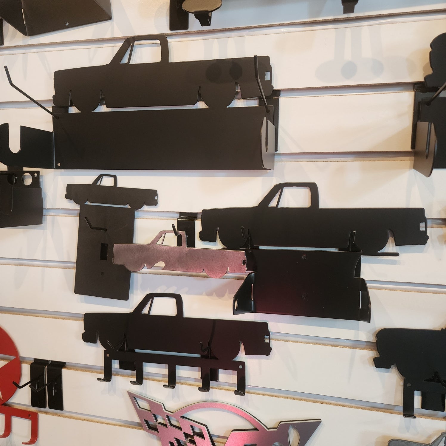 3 Piece Square Body Truck Hooks and Holders Set. Includes a free bottle opener! SAVE $$$$ with all 3. Paper Towel Holder, TP Holder and Key hook. Made from heavy duty steel, prepped and powder coated to last a lifetime. See each item for details. Usually stocked in black, most other options ship within about 2 weeks. Perfect for your man cave, garage, hot rod shop or for a special gift. Contact us for other options.