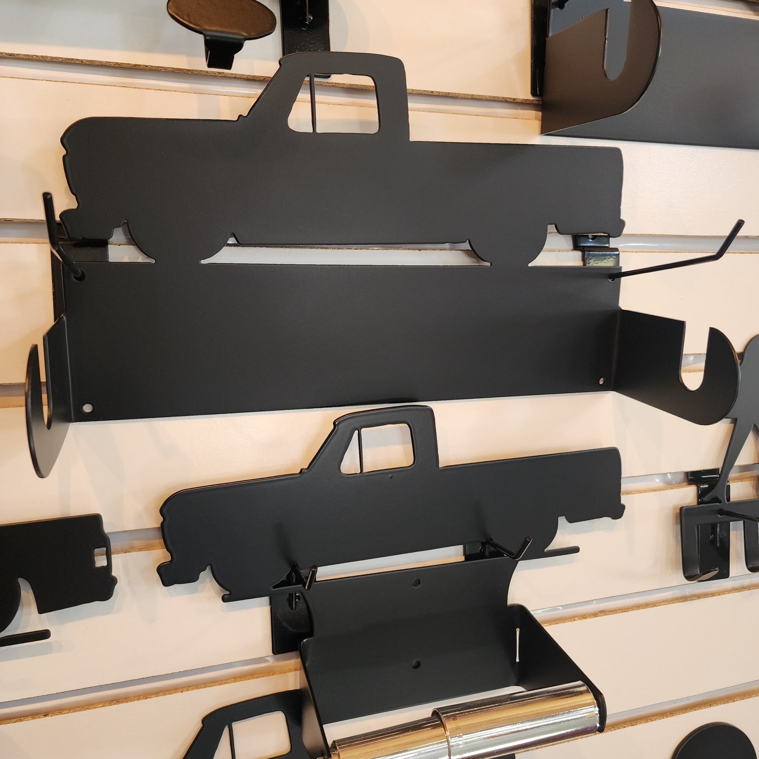 Bump Side Truck Paper Towel Holder. Made from heavy duty steel, prepped and powder coated to last a lifetime. Approx. size 12X7". Usually stocked in black, most other options ship within about 2 weeks. Includes dowel rod. Perfect for your man cave, garage, hot rod shop or for a special gift. Contact us for other options.