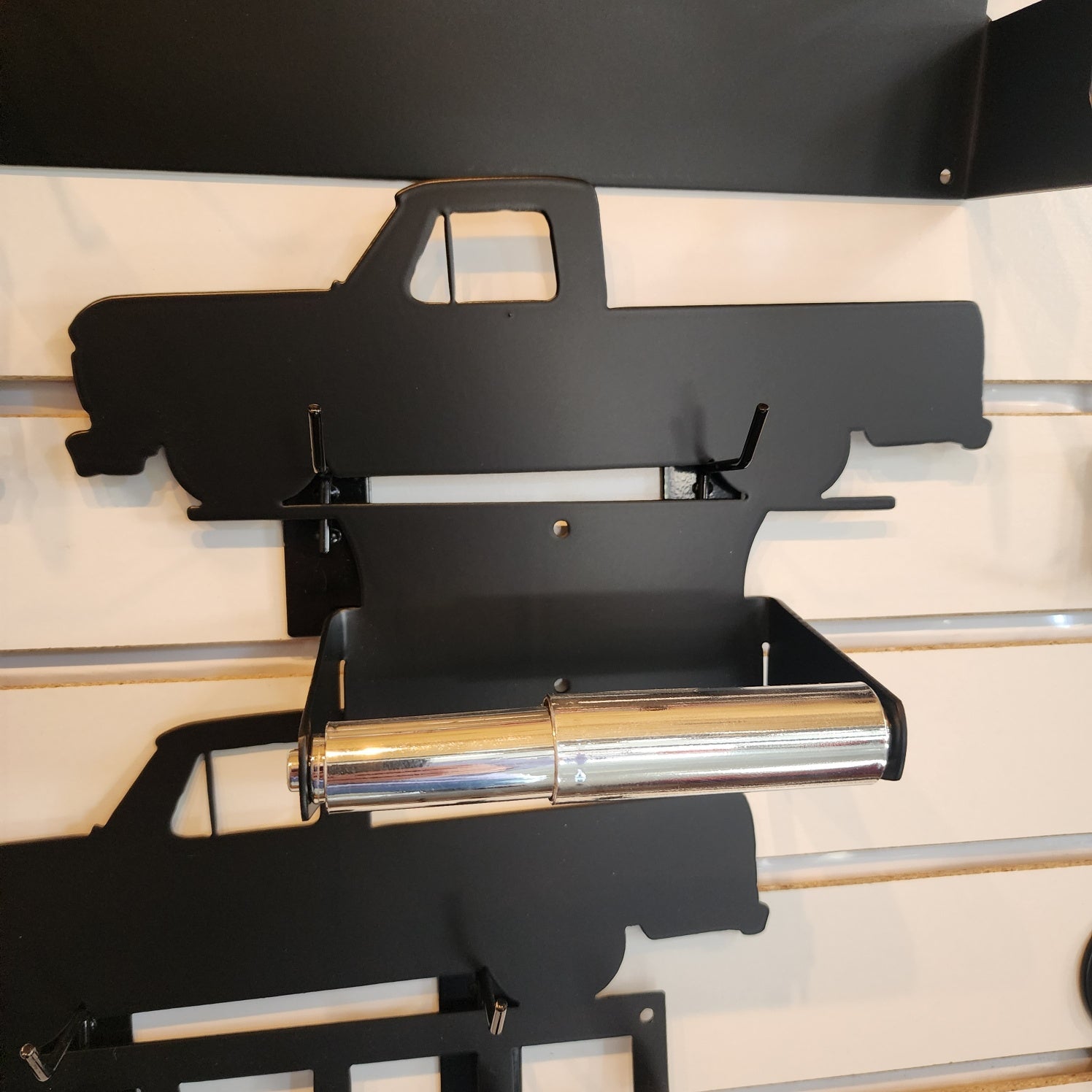 Bump Side Truck TP Holder. Made from heavy duty steel, prepped and powder coated to last a lifetime or available bare to finish yourself. Holes to hang. Order yours by adding to cart with finish choice. Includes roll holder. Contact us for other options. Usually stocked in black -others ship in about 2 wks.