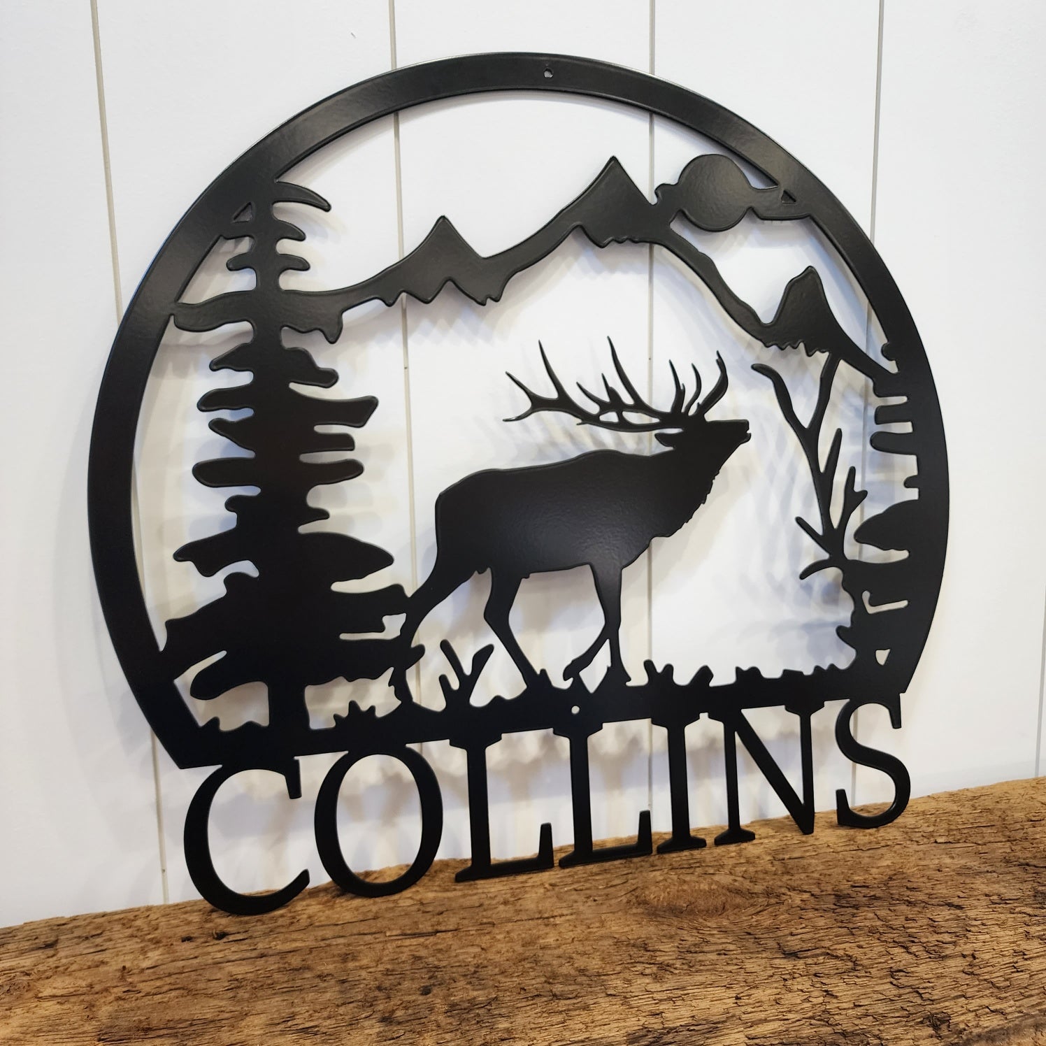 Elk Mountain Scene Name Sign. These personalized metal signs are available in many other styles, leaving customization up to you! Made from heavy duty steel, prepped and powder coated to last a lifetime. 2 holes to hang. Approx. 24x21.5". Order yours by adding to cart with color choice then adding name. Also available with WELCOME in other listings. Lettering sizes may vary with number of letters. Bare steel or powder coated to last a lifetime Contact us for additional custom metal options. Most ship within about 2-3 weeks. Perfect for inside or outside at your home or a thoughtful gift for a wedding, anniversary or house warming. Order your personalized metal sign now!