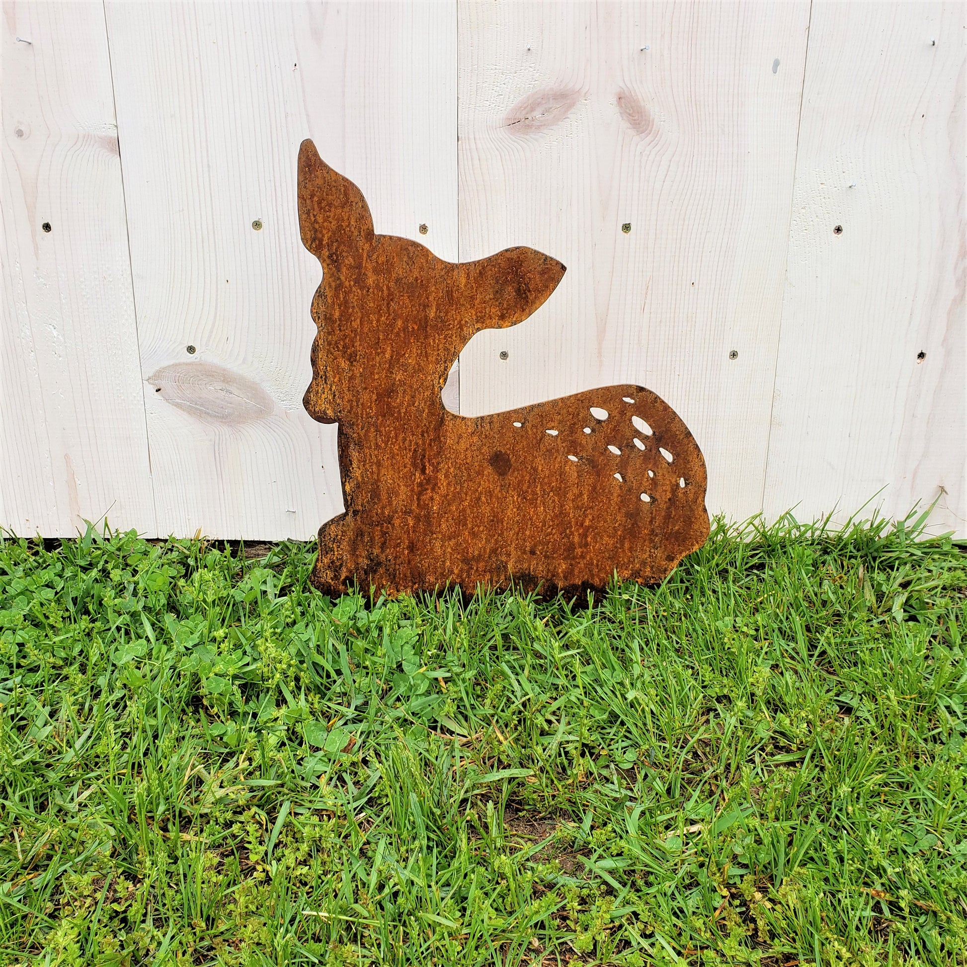 Fawn Garden Decor Metal Stake. The cutest fawn for your garden, flower bed and landscaping decor. These fawns won't bother anything, and stay the same size forever, the only kind to have in your garden. Stake attached. Buy yours at 360-STEEL. Made in America from real steel to last. Approx. 16tall x13.5". Available in bare steel to finish your way, pre-rusted or in your choice of powder coat colors.