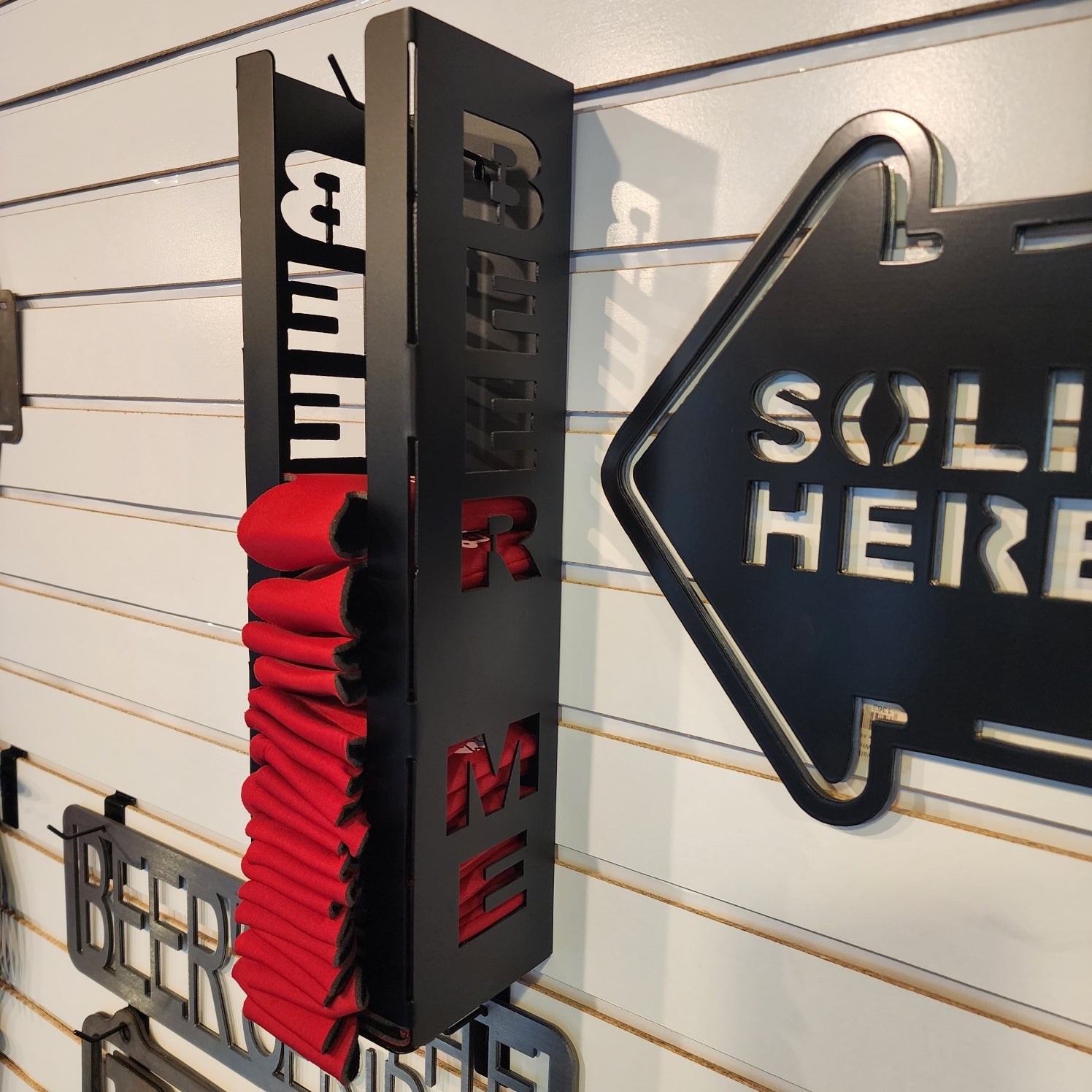 Order your can cooler holder any way you like. Standard size about 18" tall fits standard koozies. BEER ME lettering, plain sides, your name, bar name or other lettering. Choose bare steel or color choice. Made to order. Custom sizes available as well. American Made Goodness!