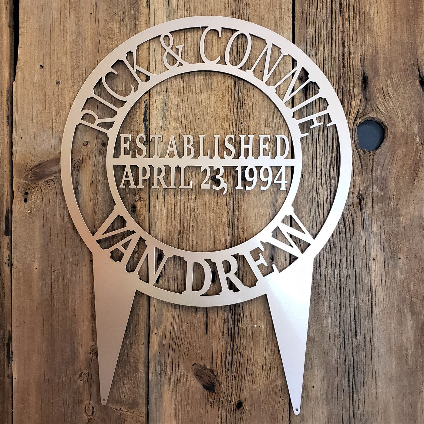 Full Name with Established Date Steel Sign. Made from heavy duty steel, prepped and powder coated to last a lifetime or available bare to finish yourself. Holes to hang. Size 20". Or, with stakes to place in the ground. Order yours by adding to cart with color choice, adding up to 2 Names for top, last name for bottom and established date for center, then with or without stakes. Contact us for other options. Most ship within about 2-3 weeks. Perfect for inside or outside at your home or a thoughtful gift for a wedding, anniversary or house warming.