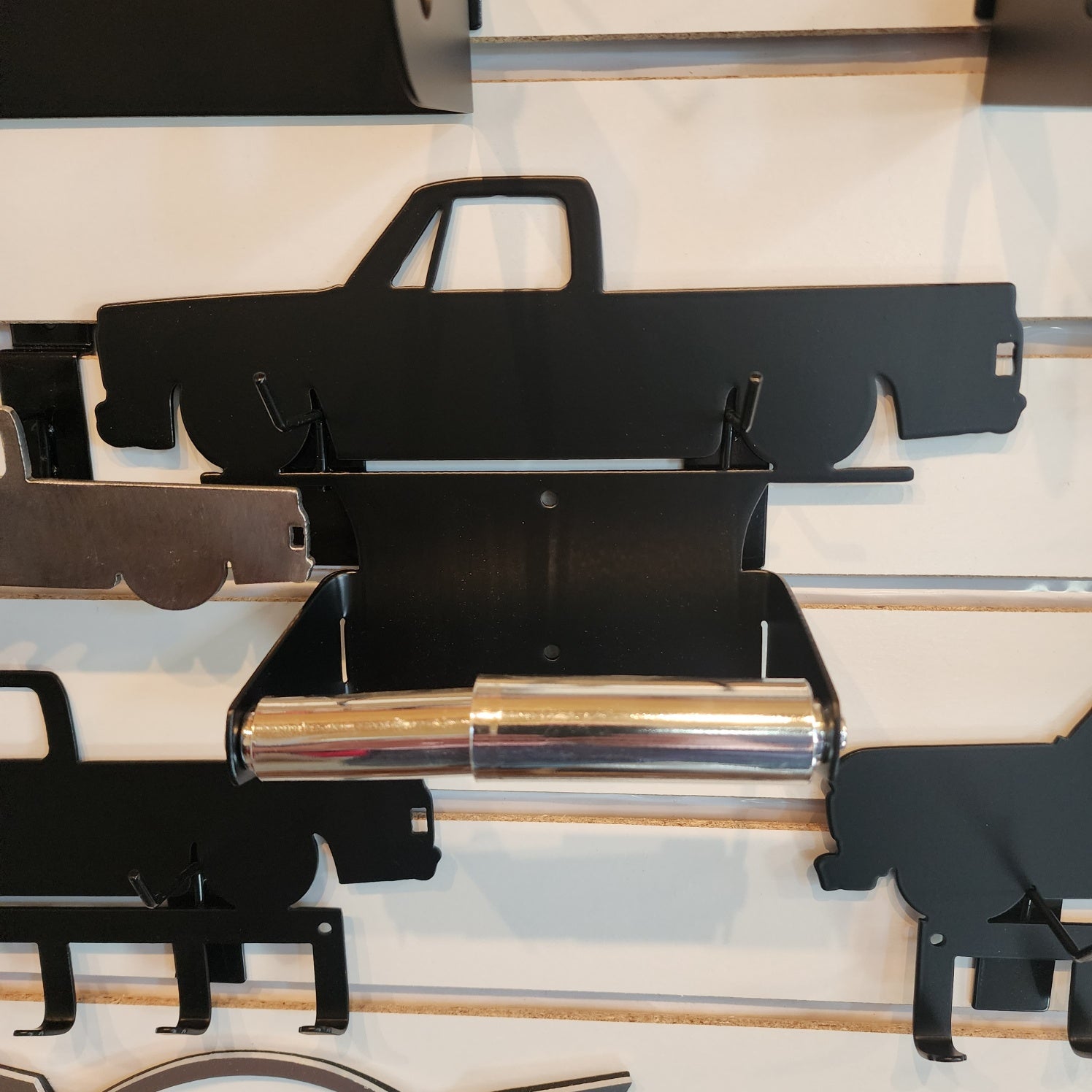 Square Body Truck TP Holder. Made from heavy duty steel, prepped and powder coated to last a lifetime or available bare to finish yourself. Holes to hang. Order yours by adding to cart with finish choice. Includes roll holder. Contact us for other options. Usually stocked in black -others ship in about 2 wks.