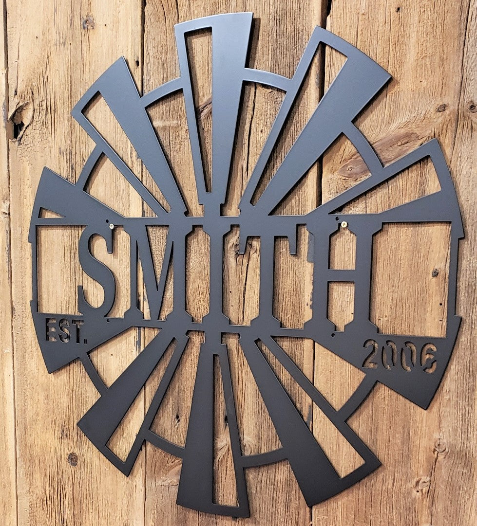 Custom Windmill blades name sign. Large 30" round. Customize with name and year. Shown in copper and satin black. Made from heavy duty steel, prepped and powder coated to last a lifetime. Drilled to mount to wall. 30" round, some letters may vary slightly. Order yours by adding to cart with color choice, name and year. Bare steel standard option available. Most ship within about 2-3 weeks. Perfect for inside or outside at your home or a thoughtful gift for a wedding, anniversary or house warming.